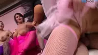 In the dark, dimlylit room of the orgy party, a group of sluts and dudes gather around eager to please each other with their insatiable sexual desires.The girls are scantily clad in stockings, exposing their tempting cunts, which draws every guy into an animalistic state of arousal.With boobs hanging out of their low tops and their asses perfectly visible through the thongs, the females are the center of attention in this gangbang orgy.As the group gathers around, the man at the center is a notorious womanizer, whose insatiable horniness demands constant attention from multiple women at once.The cunts swapping and licking each others erect clits while sucking on each others engorged boobs sends waves of sexual tension through the room.The guys are just as eager to partake in this animalistic display, as the females masturbate in front of them.One by one, the men take turns pleasuring the sluts, offering blowjobs and sucking on their cocks, using their mouths and hands to stimulate every last inch.The women, not to be outdone, return the favor by deepthroating each guy, using their mouths as cocksuckers and getting off on their own orgasms from masturbating while pleasing others.Erections spike for everyone involved in this explicit gangbang orgy.As one dude sucks on the boobs of a girl, he feels his own dick swelling at the frills of her excitement.Another woman, wearing stockings with garters, straddles her man, her pleasurefilled cries echoing throughout the room as they swapped partners in search of more.The sex continues to be an animalistic frenzy, as each person finds their perfect rhythm for stimulation.The girls lick and suck on each others cunts while receiving blowjobs from multiple men.Men and women alike exchange sexual fluids, creating a wet and wild orgy scene that would make any bystander question the limits of human desires.The room fills with moans, grunts, and sighs as the participants reach their climaxes one after another in a series of cumshots and swapping partners.The men shoot thick ropes of sperm onto the womens bodies while they suck on each others cocks, creating an erotic symphony of pleasure and satisfaction.Finally, spent and exhausted from their orgiastic escapades, everyone in the room collapses into a postcoital heap, panting heavily as their minds race through the wild and explicit sexual encounters that just took place.Their bodies glisten with sweat and cum, while their satisfied smiles signify the ultimate release of their horny desires.